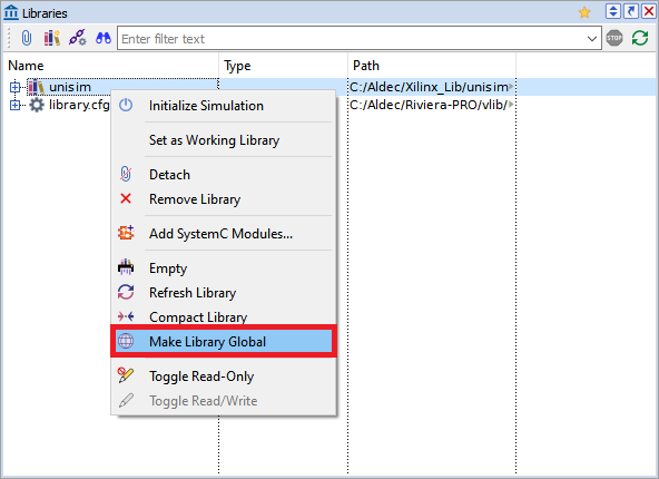 « Prev | Next » Compiling Xilinx Vivado Simulation Libraries for Riviera-PRO Introduction This document describes how you can compile simulation libraries in Xilinx Vivado Design Suite to be used in Riviera-PRO. When you instantiate a component in your design, the simulator must reference a library that describes the functionality of the component to ensure proper simulation. Thus, before performing simulation of the design that contains Xilinx components in Riviera-PRO, you should attach the proper simulation libraries. You can either use pre-compiled simulation libraries provided by Aldec (libraries can be downloaded from Aldec's website) or you can compile them yourself in the Xilinx Vivado Design Suite then attach the compiled libraries into Riviera-PRO. Requirements and Limitations This application note assumes that you have Xilinx Vivado Design Suite 2023.1 or later and Riviera-PRO 2023.04 or later properly installed and licensed. Compiling simulation libraries You can either use the compile_simlib command or the Compile Simulation Libraries wizard that simplifies compiling simulation libraries. With these tools, you can compile all IP core libraries included in the Vivado IP Catalog and the following basic Xilinx Vivado simulation libraries: UNISIM UNIMACRO UNIFAST SIMPRIM (Verilog Only) SECUREIP (Verilog Only) XILINX_VIP XPM You can find detailed description of these libraries in the following document: http://www.xilinx.com/support/documentation/sw_manuals/xilinx2019_2/ug900-vivado-logic-simulation.pdf Using the Compile Simulation Libraries Wizard Open Vivado. Go to Tools | Compile Simulation Libraries. Figure 1: Accessing the Compile Simulation Libraries. The Compile Simulation Libraries will open. Select Riviera-PRO under Simulator. Select the desired language and libraries. Figure 2: Compile Simulation Libraries: Simulator, Language and Library selection. Under the Compiled Library Location, select the directory where you want the compiled libraries to be saved. Under the Simulator Executable Path, provide the path to the directory containing the riviera.exe file in the Riviera-PRO installation directory. In the GCC executable path, add the path to the C/C++ compiler required for building SystemC IP cores. The GCC compilers provided with Windows and Linux versions of Riviera-PRO, are stored under the <Riviera-PRO installation folder>\mingw\bin and <Riviera-PRO installation directory>/gcc_Linux64/bin paths, respectively. Figure 3: Compile Simulation Libraries: paths to compiled libraries, simulator executable, and GCC compiler. By default, all the IP modules available in the Vivado IP Catalog are selected for compilation. You can change that behavior by clearing the Compile Xilinx IP check box. When cleared, only the basic simulation libraries are compiled. You may also want to enable recompilation of libraries already present in the output directory. To do so, select the Overwrite the current pre-compiled libraries check box. Figure 4: Compile Simulation Libraries: Compile Xilinx IP and Overwrite the current pre-compiled libraries. When you have specified all of your settings, select Compile. Figure 5: Compile Simulation Libraries: Compile. Once the compilation is completed, you should see the compilation summary in the Tcl Console similar to the one in the picture below: Figure 6: Tcl Console: Compilation Summary. Using the compile_simlib command In Vivado Design Suite, execute the following command from the Tcl Console: compile_simlib -simulator riviera -simulator_exec_path <Riviera-PRO installation folder> -gcc_exec_path <GCC installation folder> -family all -language all -library all -dir <output_folder> where: <output_folder> Specifies a path to the directory where you want compiled libraries to be saved. <Riviera-PRO installation folder> Specifies a path to the bin folder inside Riviera-PRO installation folder. NOTE: It might be required to put the path to the Riviera-PRO executable in quotes or curly brackets as the compile_simlib command does not accept spaces within a path. For example, the command may look as follows: compile_simlib -simulator riviera -simulator_exec_path {C:/Aldec/Riviera-PRO/bin} -gcc_exec_path {C:/Aldec/Riviera-PRO/mingw/bin} -family all -language all -library all -dir {C:/Aldec/Xilinx_Lib} Figure 7: Executing compile_simlib command from the Vivado Tcl Console. The above command will compile all simulation and IP libraries written in VHDL, Verilog, and SystemC for all devices available in Vivado. To disable compilation of IP Core libraries and compile only Xilinx simulation libraries, invoke the compile_simlib command with the -no_ip_compile argument. You may also want to disable recompilation of libraries already present in the output directory by issuing the -force argument. To obtain the complete list of available arguments, type compile_simlib -help in the Vivado Tcl Console. Once the compilation is completed, you should see the compilation summary in the Tcl Console similar to the one in the picture below: Figure 8: Library Compilation Summary. The output directory (specified with the -dir argument) will contain the library.cfg configuration file and the folders with pre-compiled libraries. Attaching Compiled Xilinx Libraries into Riviera-PRO After generating the compiled Xilinx libraries, they have to be attached into Riviera-PRO. You can either use the Library Manager window or the amap command to add required libraries. If you are using Riviera-PRO as the default simulator in the Xilinx Vivado environment 2017.4 or later, you can attach the libraries within that environment. Using the Vivado Environment In Vivado, specify the path to the directory with the compiled libraries in the Compiled library location field which is available in the Project Settings | Simulation category of the Settings window when a project is loaded. Figure 9: Pointing the compiled library location in the Vivado project settings. NOTE: You can specify the defaul