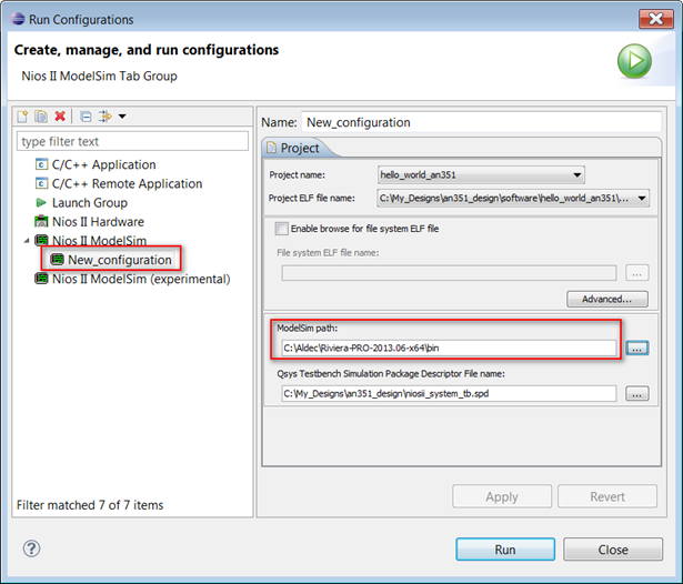 « Prev | Next » Simulating Nios® II Designs in Riviera-PRO Introduction This application note describes the steps to produce an RTL simulation environment with the NIOS® II example design (Hello World), Qsys, and the NIOS II software build tools for Eclipse. This document also provides step by step instructions on RTL simulation in Riviera-PRO. Requirements This application note assumes following: You have the following software installed and licensed: Altera Quartus® II version 13.0.0 or later and all devices from Altera Riviera-PRO 2013.06 or later You have experience using Qsys and have familiarity with the Riviera-PRO simulator. You have downloaded the example design used in this application note (an351_design.zip). You can download this example design from http://www.altera.com/support/examples/nios2/exm-simulating-niosii.html You have extracted the example design. NOTE: The location where you extract the file will be referred to as <project_directory> Setting and Generating the simulation environment in Qsys Start the Quartus II Software. Click File | Open Project. Browse to <project_directory>/an351_design, select an351_project.qpf and click Open. Figure 1: Opening example design Now open Qsys by clicking Tools | Qsys. Once Qsys is opened it will ask you to open the system file. Select the niosii_system.qsys file and click Open. This file is located in the <project_direcoty>/an351_design directory. Figure 2: Opening Qsys system file Click on the Generation tab. Set the following parameters to these values: Create simulation model – None Create testbench Qsys system – Simple, BFMs for clocks and resets NOTE: If you system has exported ports other than clock and reset, choose Standard, BFMs for standard Avalon interfaces Create testbench simulation model – Verilog Create HDL design files for synthesis – none Create block symbol file (.bsf) – Uncheck Click Generate. Save the system by clicking File | Save once Generation is done. NOTE: The example design is a complete Qsys system. Make sure that your Qsys system is completed before generating simulation models. Generated files include: rivierapro_setup.tcl (<project_directory>/an351_design/niosii_system/testbench/aldec) Qsys system testbench file and Memory initialization files (.mif) (<project_directory>/an351_design/niosii_system/testbench/niossii_system_tb/simulation) Creating Nios II software Open Nios II Software Build Tools for Eclipse version Indigo Service Release 2 (13.0 or later) Click File | New and select Nios II Application and BSP from Template. Figure 3: Creating new application Select the SOPC Information (.sopcinfo) file name by browsing to <project_directory>/an351_design, and then select niosii_system.sopcinfo. Specify hello_world_an351 as the project name. Select Hello World from the Templates option and click Finish. Figure 4: Selecting template Right-click on hello_world_an351 in the Project Explorer and select Build Project. This step builds the hello_world project and creates all necessary files for simulation. Figure 5: Building Project Running Simulation in Riviera-PRO Once the build project is done, right-click on hello_world_an351 in the Project Explorer and select Run As | Run Configurations…. Figure 6: Setting Configuration In the Run Configuration window, right-click on Nios II ModelSim and select New. This will create a New_configuration sub-tab under Nios II Modelsim. NOTE: Steps 14 and 15 are required if you are using Nios II SBT for the first time and have never setup a configuration for Riviera-PRO before. Once the configuration is setup for Riviera-PRO, you can run simulation by directly selecting Nios II Mosdelsim from Run As. Figure 7: Creating new configuration In New_configuration, provide the Riviera-PRO executable path. Select Apply and Run. Figure 8: Setting Configuration The above action will invoke Riviera-PRO and start executing the script. This will result in errors in Riviera-PRO. By default, Nios II SBT starts Riviera-PRO in the wrong directory. The correct directory should be …sim/aldec. It generates simulation scripts for Aldec. Click on the Change Directory button from the Filesystem tab of Riviera-PRO. NOTE: Because of wrong directory it automatically starts executing script which was created for mentor, this results in error. Figure 9: Changing directory Select the aldec folder as the current directory from the Select a Directory window. Figure 10: Selecting aldec as current directory This will set aldec as a current directory. Open the rivierapro_setup.tcl script file and execute it. This will set all necessary variables and will copy all memory files to current directory. NOTE: Click the Execute button from script editor tool bar. Figure 11: Executing tcl script Script execution will set aliases which can be run as a command in the Riviera-Pro console for creating libraries (both device and work), compiling libraries, compiling the hello world example source files (Qsys tb system), and initializing simulation (elaboration). Figure 12: Setting variables and aliases through script Now let’s start simulation process by compiling device library files. Type dev_com in the Riviera-PRO Console and hit Enter. NOTE: If the small circle is spinning in top right corner of riviera-PRO that means Riviera-PRO is executing some process. Figure 13: Compiling Device Libraries Once device libraries compilation is done, type com in the Riviera-PRO Console and hit Enter. This will compile all of your Qsys system tb in different work libraries. NOTE: You can observe components compiled into libraries by expanding the respective library from the Library Manager in Riviera-PRO. Figure 14: Compiling Qsys tb system Once compilation of tb system is done, you can start the elaboration of the system using the top level module. This can be done using elab alias command. Type elab in the Riviera-PRO Console and hit Enter. igure 15: Elaborating Design Once elaboration is done you will se