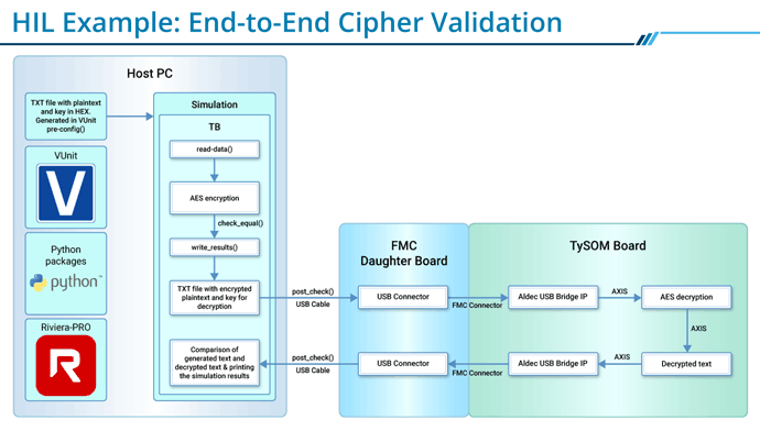 Bridging Simulation and Hardware Hardware-in-the-Loop in Action Aldec, Technical Marketing Team Like(0) Comments (0) Whether developing FPGAs, ASICs, or AI-enabled embedded systems, verification remains one of the most challenging and time-consuming phases of the development process. Hardware-in-the-Loop (HIL) testing is transforming this process. By merging simulation and real hardware into a single real-time verification environment, HIL enables faster, safer, and more accurate validation — long before physical prototypes are ready. What Is Hardware-in-the-Loop (HIL)? Hardware-in-the-Loop (HIL) is a real-time verification methodology that integrates simulated system models with physical hardware components. It allows engineers to replace certain hardware blocks with high-fidelity software models that behave identically to their real counterparts. This enables engineers to: Perform early validation of hardware and firmware functionality. Test fault scenarios safely and repeatably. Improve time-to-market with faster iteration cycles. However, HIL can be complex to implement due to synchronization between software models, real-time interfaces, and hardware execution. Aldec addresses this with a fully automated HIL environment built around its flagship verification tools. The Aldec HIL Setup: Simulation Meets Hardware Aldec’s Hardware-in-the-Loop (HIL) verification solution brings simulation and hardware into perfect alignment. It combines Riviera-PRO, VUnit, and the TySOM Zynq MPSoC board into one intelligent ecosystem designed for FPGA and SoC verification, AI prototyping, and real-time hardware validation. VUnit – Automated Test Orchestration VUnit serves as the automation backbone of the HIL setup. Using Python scripting, it orchestrates simulations, runs regression tests, generates configuration data, and validates results — all without manual intervention. Engineers can execute multiple test suites in parallel and automatically verify encryption, communication, or AI algorithms in hardware. Riviera-PRO – Advanced Simulation and Debugging Riviera-PRO, Aldec’s high-performance HDL simulation platform, is used to model, simulate, and debug digital designs. It provides advanced waveform visualization, test planning, and code coverage analysis. Engineers can view real-time signal activity, use bookmarks and cursors, and generate automated coverage reports to track test completeness. Riviera-PRO’s Python integration with VUnit ensures that the simulation results and hardware data are synchronized and verified in one continuous flow. TySOM Zynq MPSoC – Real Hardware Execution The TySOM board acts as the hardware testbed. Built on the Zynq UltraScale+ MPSoC, it combines programmable logic and embedded processing in a single board. In Aldec’s HIL setup, the programmable logic is used to execute design modules such as cryptographic cores, data interfaces, or AI accelerators in real time. This allows engineers to validate hardware blocks under realistic conditions while maintaining control and observability through simulation. Aldec USB Bridge IP – Seamless Host-FPGA Communication A crucial part of Aldec’s setup is the Aldec USB Bridge IP, implemented directly in the FPGA fabric. It enables high-speed communication between the simulation host and the TySOM hardware. The bridge supports bi-directional data exchange between the Python-based VUnit environment and FPGA hardware, ensuring low-latency synchronization between simulation and real-world operation. Why It Matters This integrated setup allows engineers to: Verify HDL modules and system-level interactions in real hardware. Automate testing and debugging with minimal setup time. Accelerate FPGA verification for AI, automotive, and embedded applications. Gain full traceability between simulated signals and live hardware behavior. The figure above illustrates Aldec’s Hardware-in-the-Loop (HIL) verification setup for AES encryption and decryption. On the Host PC, tools such as VUnit, Python automation, and Riviera-PRO manage test orchestration, simulation, and result validation. The process begins with a pre-configured script that generates plaintext and encryption keys in hexadecimal format. During simulation, the testbench (TB) performs AES encryption, verifies the output, and exports the encrypted data and key to a text file. This data is transferred via a USB interface through an FMC Daughter Board to the TySOM FPGA board, where Aldec’s USB Bridge IP manages high-speed communication with the programmable logic. The FPGA then executes AES decryption in real time using the AXI Stream interface. The decrypted text is sent back to the host system, where the post-check function compares it against the original plaintext to confirm end-to-end correctness. This setup demonstrates a complete closed-loop verification process, combining the precision of simulation-based verification with the performance of FPGA hardware execution. It highlights how Aldec’s integrated HIL framework enables real-time co-simulation, automated data exchange, and comprehensive validation for complex FPGA and AI hardware designs. Conclusion Aldec’s Hardware-in-the-Loop verification framework redefines the relationship between simulation and hardware. By integrating Riviera-PRO, VUnit, and the TySOM FPGA platform, it delivers a unified, automated, and intelligent environment for verifying FPGA, SoC, and AI-based designs in real time. See the techniques, live demonstrations, and HIL in action. Watch the full webinar to explore these insights further. For additional resources and a free trial of ALINT-PRO, visit www.aldec.com/products or contact sales@aldec.com for more information. Watch the Webinar: Bridging Simulation and Hardware: Hardware-in-the-Loop in Action Tags:Aceleration,Embedded,FPGA,Hardware,HDL,Prototyping,Simulation,Xilinx,Design