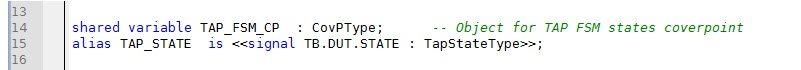 My First Example with OS-VVM CoveragePkg A Guest Blog from Alex Grove of FirstEDA Alex Grove, Alex Grove, Applications Specialist at FirstEDA Like(3) Comments (1) Here in Europe, I recently had the opportunity to work with Jim Lewis, OS-VVM Chief Architect and IEEE 1076 Working Group Chair, on the first Advanced VHDL Testbenches & Verification training course. This training, held in Bracknell, UK, was attended by engineers from several major European system companies who design and verify programmable devices (FPGAs). VHDL is by far the dominate language used by Europe’s system companies for the design and verification of FPGAs, however it is unclear to many how to enhance their verification with VHDL. What I have found is that experienced FPGA design engineers (including myself) are not utilising the VHDL language for verification. Verification with VHDL Jim Lewis introduces VHDL’s verification capabilities, including new VHDL 2008 features and the Open Source VHDL Verification Methodology (OSVVM). OSVVM provides a methodology for testbench development and verification packages that provide functional coverage and random value generation. To demonstrate the use of the OSVVM functional coverage package ‘CoveragePkg’, I took a familiar Finite-state Machine (FSM) the IEEE 1149.1 TAP (Test Access Port) controller. This is a clever little state machine that I am rather fond of, having spent a lot of time working with it as part of my degree dissertation on Built-in Self Test (BIST). So let’s take a look at our IEEE 1149.1 TAP FSM. The TAP FSM transitions are controlled by the Test Mode Select (TMS) signal. The TAP controls the JTAG system performing serial shift and parallel load of the data registers (DR) and instruction registers (IR). Figure 1: TAP State Machine Code Coverage vs Functional Coverage To explain what functional coverage is and the value in terms of verification, let’s first take a look at code coverage. Code coverage is a technique that uses instrumentation to record the execution of the code within the simulator. Two well-known techniques are statement and branch coverage. Statement coverage tells you which statements have been executed in simulation i.e. “hit”. Branch coverage provides information about the branches taken of control structures such as ‘if-then-else’ statements. So let’s run my example test scenario for the TAP FSM and take a look at the code coverage reports. Figure 2: Sample Code Coverage Reports In Figure 2, statements that have not been “hit” are highlighted in red. From the report we can see that our test scenario does not test (cover) all the state transitions. This is what code coverage provides; it tells you what has not been tested, and is a very valuable metric for any verification process. However, we would be wrong to say we have tested (covered) all the “green” state transitions. Why? Code coverage records the execution of the code not the function and so is sensitive to delta cycles. Let’s work through an example to illustrate what can happen. Looking at the statement coverage report, you might think that we have exercised the two transitions of the SHIFT_DR state (i.e. SHIFT_DR to SHIFT_DR, and SHIFT_DR to EXIT1_DR). For the test scenario the FSM is only ever in SHIFT_DR for one clock cycle. So what happened? Let’s take a look at the waveform (Figure 3) with the delta cycles enabled. Figure 3: Waveform showing delta cycles The TAP FSM consists of two VHDL processes; combinatorial next state logic and a sequential state register. For this simple example I added a concurrent signal assignment (TMS_SIG) to TMS so as to introduce a delta cycle. What has happened is the combinatorial next state process was run twice, once with TMS_SIG equal to ‘0’ and a second time with TMS_SIG equal to ‘1’. This was due to the introduced delta cycle and the sensitivity list of the next state process. The execution in the simulator is shown in Table 1. Table 1: The execution of signal evaluation and update in the simulator So the TAP FSM next state logic settled on EXIT1_DR. The functional state transition that took place was SHIFT_DR to EXIT1_DR. However, in the simulation delta cycles 2 and 3 we executed each branch of the if-then-else statement for the SHIFT_DR next state logic. This is the difference between functional coverage and code coverage. Functional coverage collects the actual state transitions (the function) so as to build up a complete picture of how the FSM has been functionally exercised. This is achieved with a coverage model. Adding Functional Coverage with OS-VVM Creating a coverage model with the OS-VVM package ‘CoveragePkg’ turned out to be very simple. Let’s walk through the steps to create a coverage model for the TAP FSM. First you need the OS-VVM packages, these are included in the Aldec simulator and are available for download on the OS-VVM website. Next we need to create a coverage object for the FSM, which is a protected type from ‘CoveragePkg’ and used to collect and report the functional coverage. So to observe the TAP FSM state register in the testbench we use a VHDL 2008 external name and alias this to the TAP_STATE. The TAP FSM uses an enumerated type which is defined in the package ‘TapTypes’. Next we use a process to define the valid state transitions and collect data - this is the coverage model for our TAP FSM. We can give our coverage object a unique name which is then used for reporting. To define the state transitions we use cross coverage which defines relationships between multiple objects, in this case the current and previous state of our TAP FSM. To do this we need to capture the state transitions in tabular form with ‘current’ and ‘next state’. You could extract the FSM from the RTL as this is a relatively straightforward task, assuming you have a defined FSM coding style. However as a verification model it would be considered good practice to use the ori